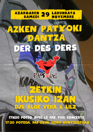 Pour célébrer comme il se doit ces 40 ans de Patxoki et souhaiter longue vie au Patxoki berri, rendez-vous est donné samedi 29 novembre pour une dernière fête dans l’actuel bâtiment, au 23bis rue des Tonneliers à Bayonne. Le Patxoki invite toutes les générations de militant·es et d’artistes l’ayant animé, tous les bénévoles y ayant travaillé et toutes les personnes y ayant vécu des soirées inoubliables à venir y fêter ensemble la “Der des ders”, soirée festive, musicale et militante.